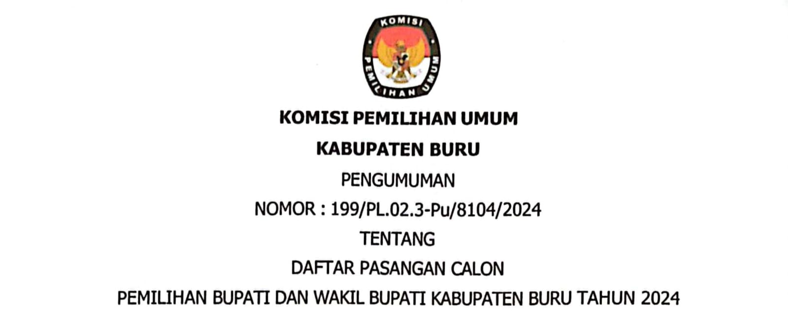 PENGUMUMAN NOMOR : 199/PL.02.3-PU/8104/2024 DAFTAR PASANGAN CALON PEMILIHAN BUPATI DAN WAKIL BUPATI KABUPATEN BURU TAHUN 2024